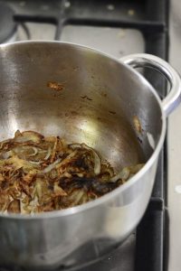 כשהבצל מטוגן יפה, על גבול השחום-שרוף (ראו תמונה), מוסיפים את הבורגול והאורז ומערבבים היטב.